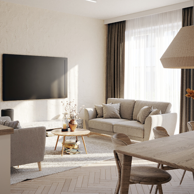 Salon w Błękitnym Wawrze ma imponującą wysokość 2,90 m – znacznie więcej niż typowe 2,50 m spotykane w większości mieszkań. Te kilkadziesiąt centymetrów różnicy przekłada się na zupełnie inny odbiór wnętrza. Dodatkowo salon usytuowany jest od strony południowej, co oznacza doskonałe nasłonecznienie przez większą część dnia.